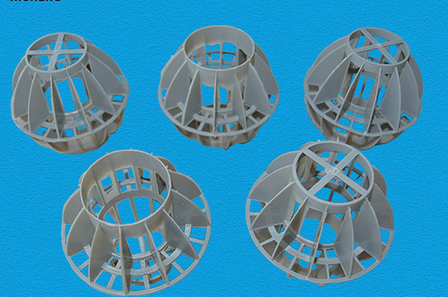 多面空心球中間鏤空結(jié)構(gòu)形成空隙大,不易被阻塞的特性。這種結(jié)構(gòu)在空氣洗滌、廢氣吸收、灰塵過濾等廢氣處理工程方面應(yīng)用,具有處理風(fēng)量大、阻力小的特點。由于多面空心球的空隙中有較高的滯液量,可使塔內(nèi)液體停留時間長,從而增加了氣體與液體的接觸面積和接觸時間,便廢氣得到充分吸收處理。